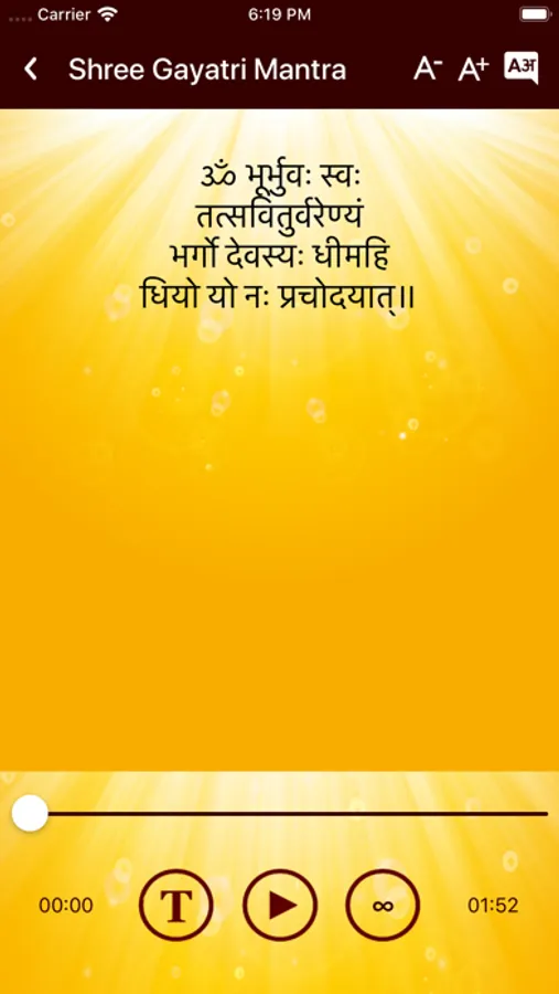 (Oh God, the Protector, the basis of all life, Who is self-existent, Who is free from all pains and Whose contact frees the soul from all troubles, Who pervades the Universe and sustains all, the Creator and Energizer of the whole Universe, the Giver of happiness, Who is Pure and the Purifier of all, let us embrace that very God, so that He may direct our mental faculties in the right direction.)