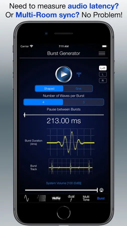 • PLAY TEST TONES Sine, Rectangular, Triangular and Sawtooth.