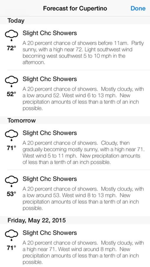 A simple and clean weather app that gets you the weather wherever you are in the United States. No complicated setup. Start the app and within moments get the weather where you are. Tap the weather icon to get the seven day forecast.
