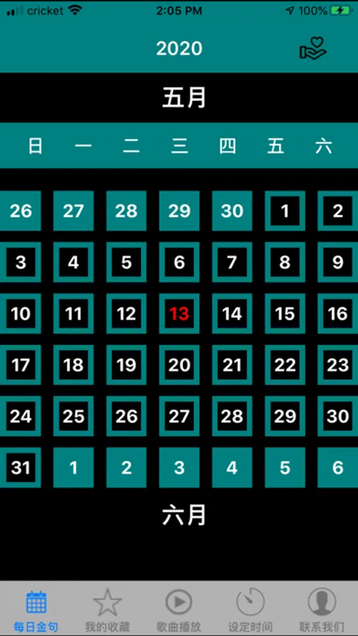 这是一个很特别的日历,你只要轻触日历上的任何一个日子,一段经文便会出现在一幅优美的图画上面。如果你向右或者向左轻拂当前的画面,下一个日子或者上一个日子的经文和图画便会出现在你的眼前。你不仅可以阅读今年上半年每个日子里的每段经句,你还可以通过不断变化的画面来感受上帝创造万物的美好。