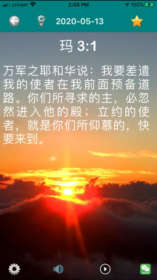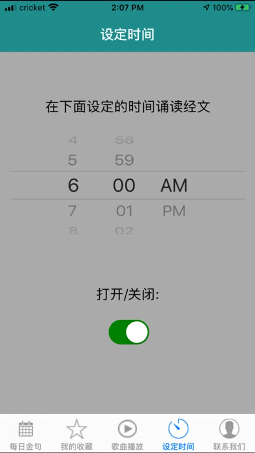 另一个对你也许有用的功能是你可以用主页面下方的《设定时间》去设定一个时刻,每天当这个时刻来临的时候,你的手机画面上方就会自动提醒你,告诉你现在是读每日金句的时候了(你可以随时关闭这个功能)。