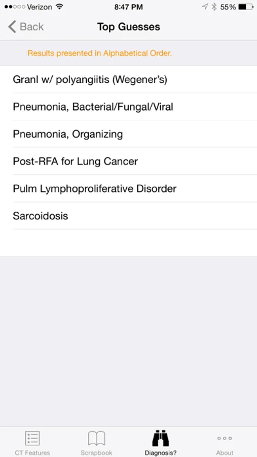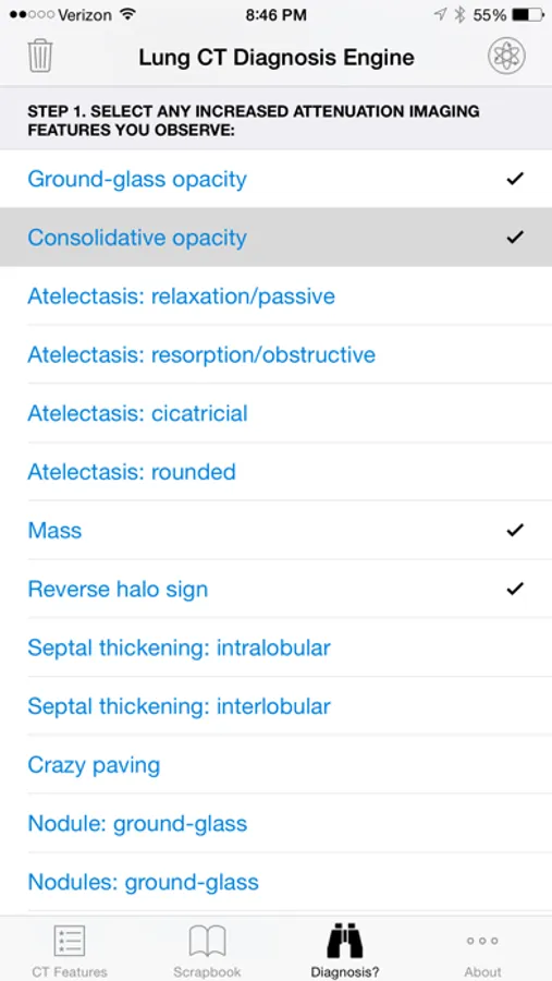· Experimental diagnosis engine takes your lung CT observations and will try to suggest a differential diagnosis list to consider - for educational purposes only