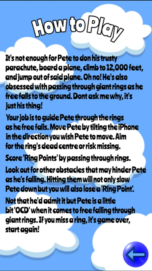 - Your job is to guide Pete through the rings as he free falls. Move Pete by tilting your device in the direction you wish Pete to move. Aim for the ring's dead centre or risk missing.