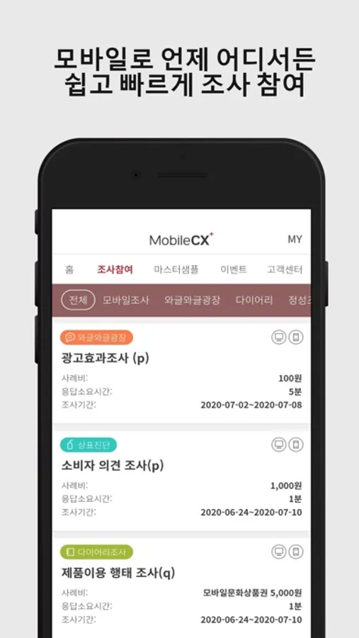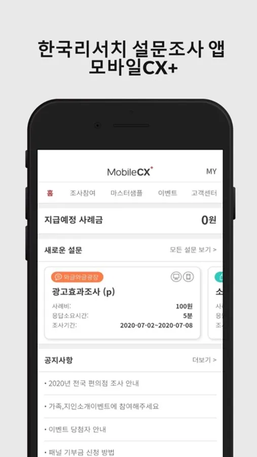 한국리서치 모바일 앱 MobileCX+를 설치하시고, 다양한 설문조사에 참여하세요.
