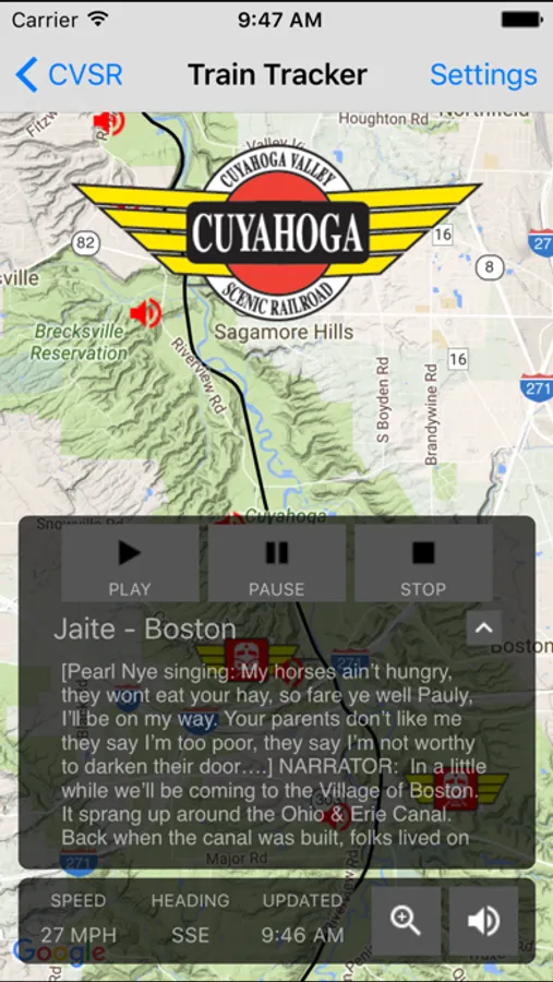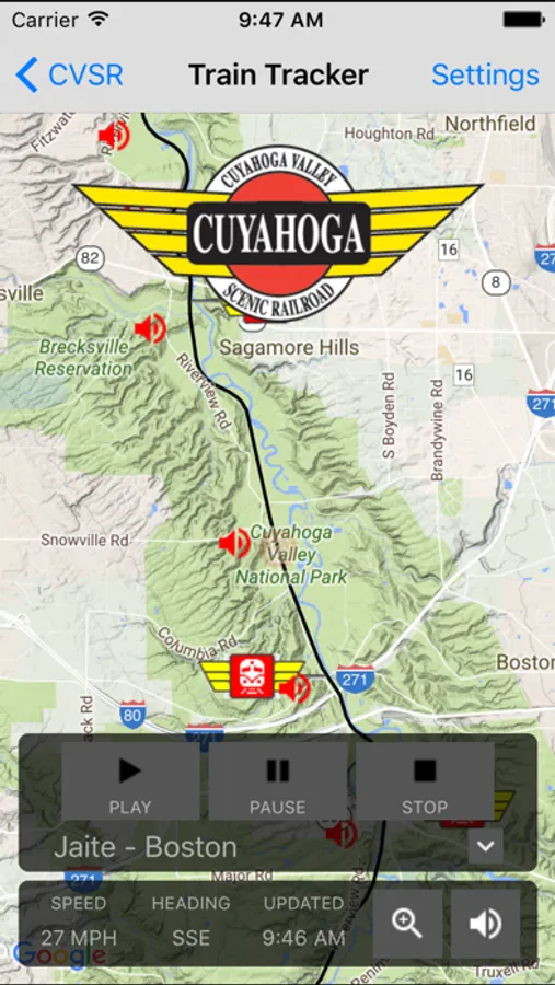 The Cuyahoga Valley Scenic Railroad Train Tracker App allows you to follow the train right on your smartphone! Bike Aboard cyclists can tell where they are and where the train is at any time to determine when and where to board. Display a street map, terrain map, or satellite map of the valley, and zoom in for detail. The app displays the train's current speed, heading, time of the last update, and even allows you to purchase tickets right from your phone.