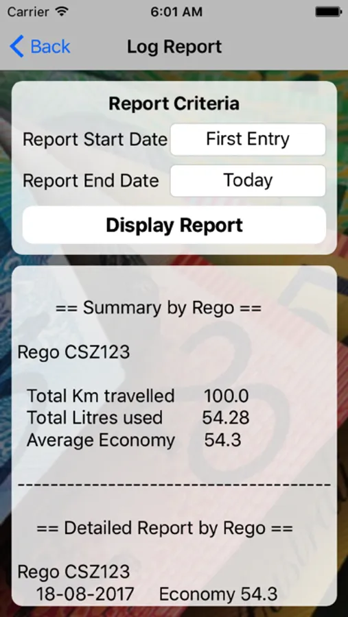 If you then wish to track the fuel economy of your vehicles in litres per 100km (L/100Km), “Fuel Check” provides a tool to do this for multiple vehicles. You will then be able to produce economy reports for all your vehicles. The fuel economy report will show the average fuel economy (L/100Km) for a given period along with all the entries for that period. This can be useful in determining if there is a developing issue with your vehicle that needs to be addressed (i.e. Requires a tune up).