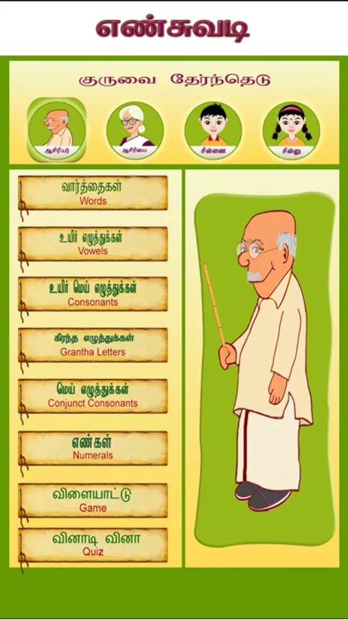 Tamil ! One of the most powerful language in earth. Tamil is evolved through the reformation process of centuries. Tamil is the mother tongue of Tamil Nadu Each Tamilians is proud by themselves for being the spoke person of Tamil. Unfortunately a certain percentage of the Tamilians are living outside Tamil Nadu for their job purpose. This application is also helpful for the kids who are residing in Tamil Nadu but missing the opportunity to learn Tamil due to the use of other language medium in nurseries. So, as the result, the NRT kids are missing the vibrant power of Tamil through out their lives.