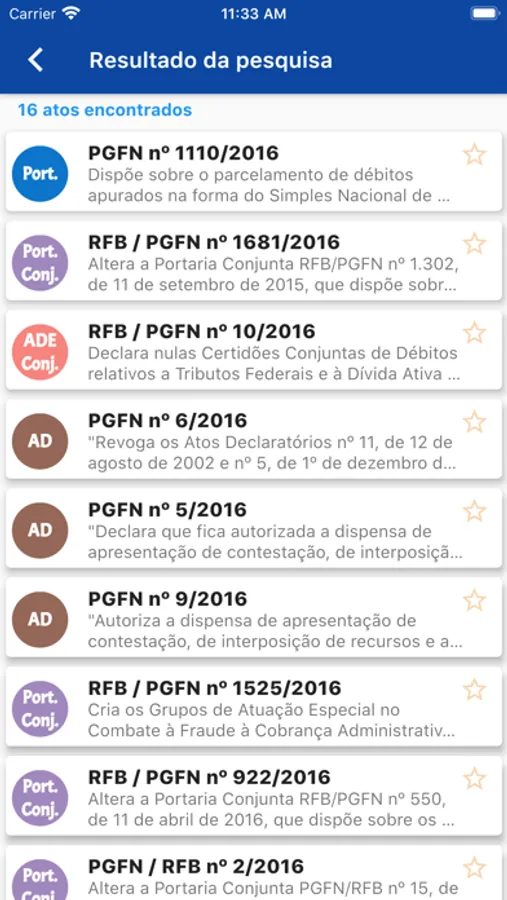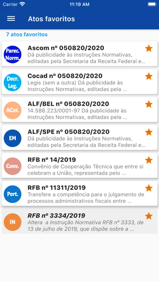 - receber notificação sobre alterações ou revogações dos atos favoritos