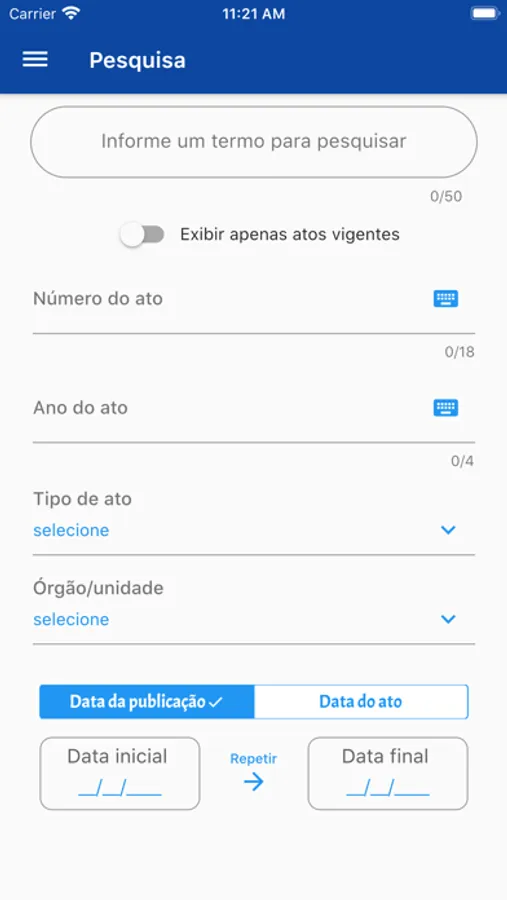 - realizar buscas por dados como tipo do ato, órgão/unidade emissora, número do ato, ano do ato e datas de assinatura e de publicação