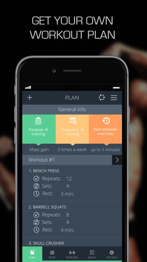 - Catalog of exercises. Detailed descriptions with animated diagrams and guides are available for all the exercises. Also, you can add your own exercises, assign a picture to them and use them in your workout plan.