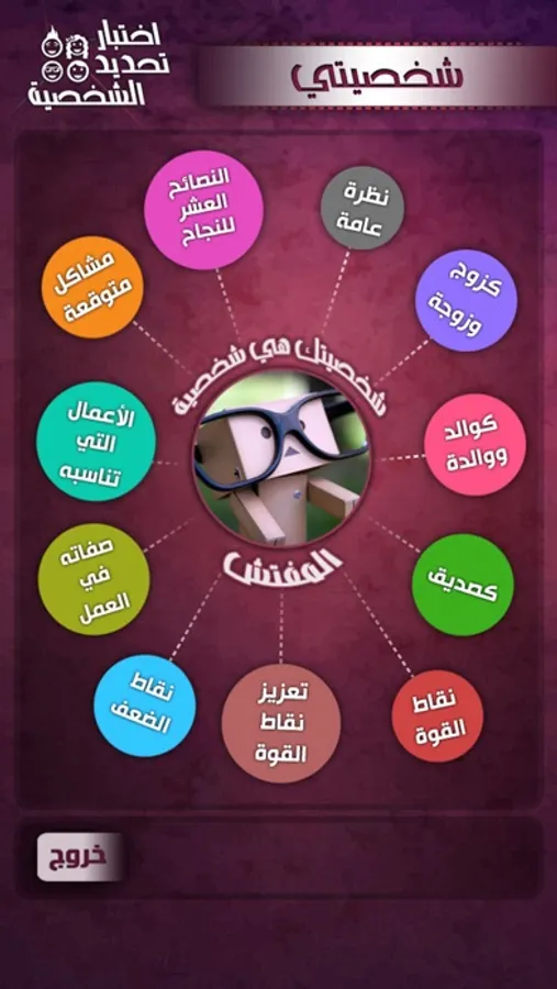 في هذا التطبيق ستقوم بالإجابة على ٣٦ سؤال لتحديد شخصيتك ومعرفة أدق تفاصيل شخصيتك ونقاط قوتك وكيفية تعزيزها ونقاط ضعفك وكيفية معالجتها بأسلوب علمي يعتمد على مؤشر مايرز بريغز للأنواع.