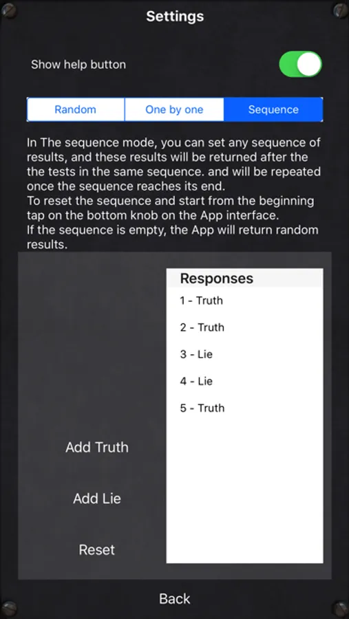 3- Sequence, and this is the most advanced method. it enables you to set a sequence of results, that the app follows. then you can just give the device to your friend and the app will follow your instructions without even touching it. no one will detect what you did.
