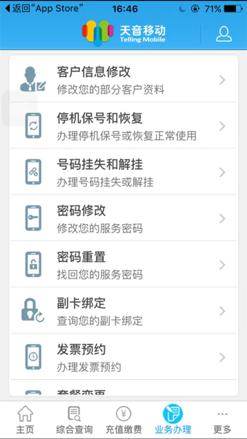 2、业务办理,您可以办理停机保号业务、服务密码修改和重置、副卡绑定。