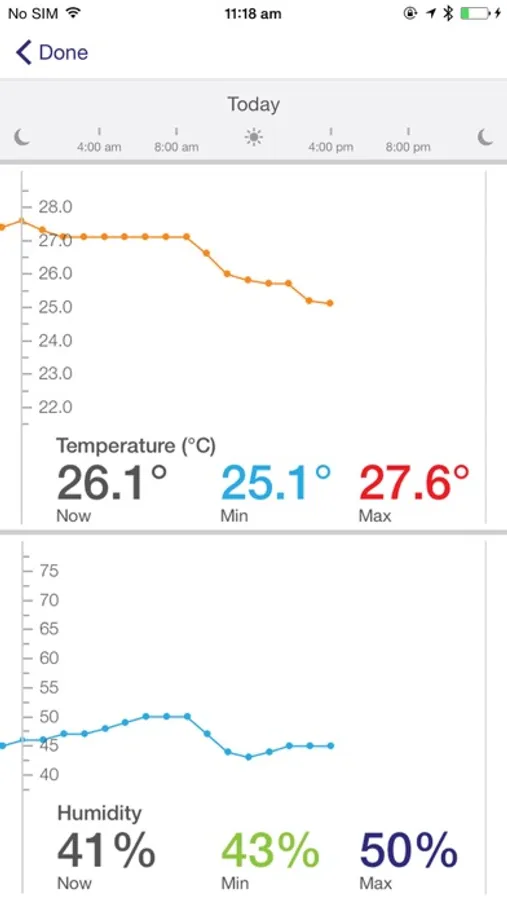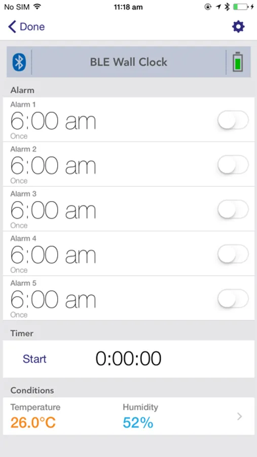 - Current temperature and humidity with historical chart (Available on BLE Alarm Clock only)