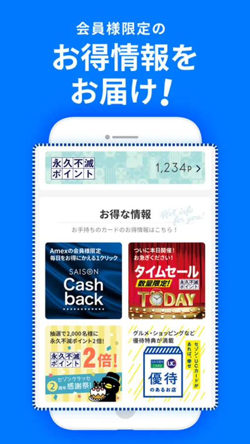 セゾンカードの公式アプリ!ご利用明細やポイントの確認をはじめセゾンカードの様々なサービスや便利な機能・お得な情報が集約されています。