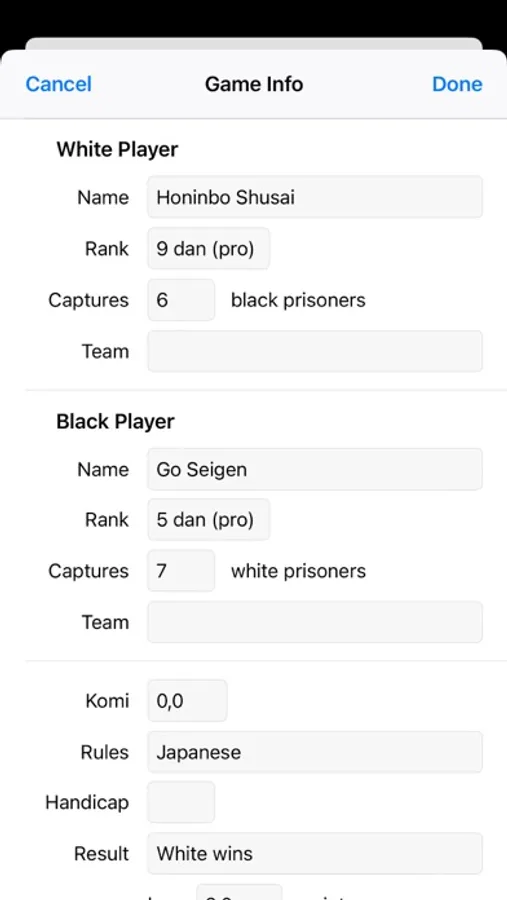 Include game information like player names, ranks, captured stones, … and copy the SGF file to the clipboard, send it as an email, save it to Dropbox or export it to apps like EasyGo or SmartGo Kifu.