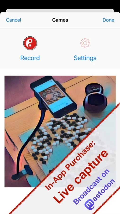 - Game recording: Live capture your game with automatic move recognition, automatic photos and photos triggered with a bluetooth camera remote. Broadcast to Mastodon is also possible. (Includes all features of the Scoring subscription)