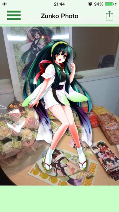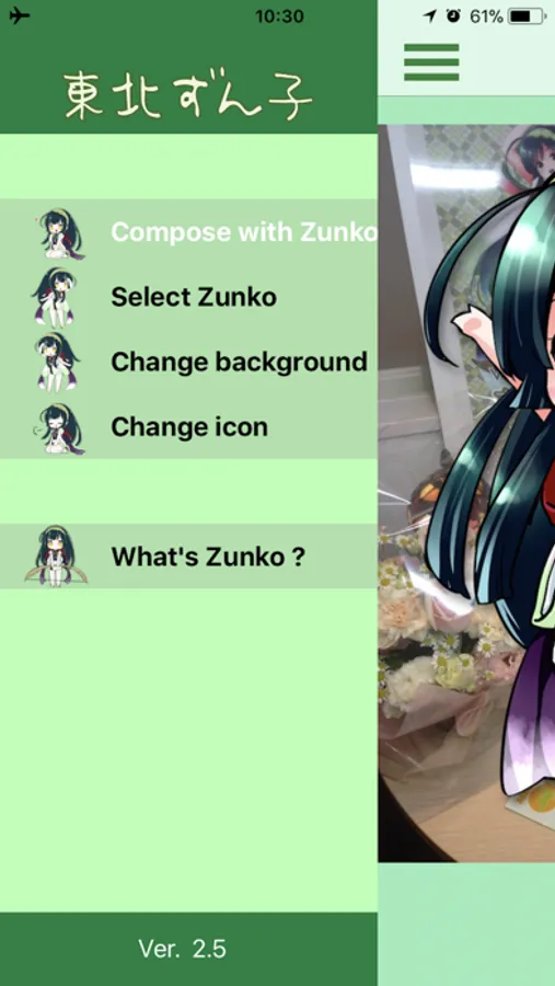 This application puts "Zunko" on the background of the photograph saved for the album of the Photo app or the picture with the camera.