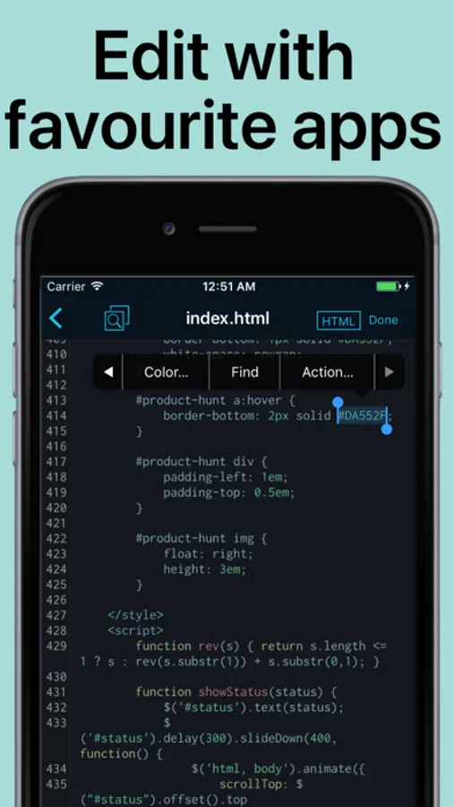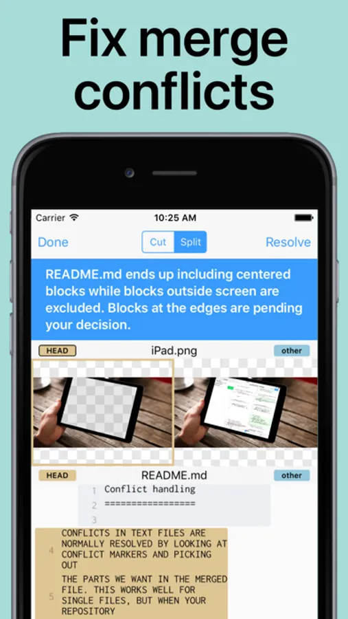 When you do need to perform real work on iOS, Working Copy is a powerful tool. Editor has syntax highlighting for more than 50 programming languages and a built-in color picker. Preview images, Markdown and HTML files with a Javascript console pointing to errors in your code. Create new branches and merge or rebase them back, with a brilliant merge-tool for handling conflicts. If you need to automate your work there are Working Copy actions in the Shortcuts app for most operations.