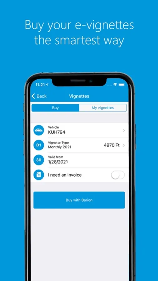 No more stopping at a gas station in the last minute because you forgot to buy your e-vignettes. You have to just open Barion Wallet, choose one of your previously saved cars (license plates) that you would like to buy the e-vignette to, select the type of the e-vignette (10-days, monthly, etc.) and press the „Buy” button.