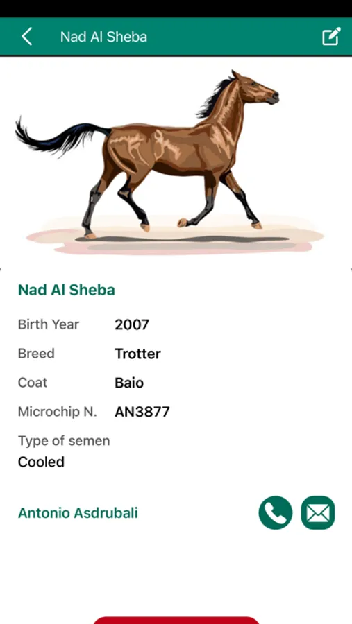 A Stallion chart with important physical data, the type of commercialized semen, and the agent contact information.