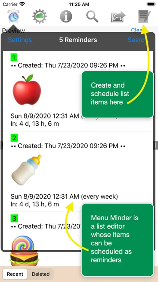 • Export reminders or recents as text, mail, messages, PDFs, or Menu Minder's own document format via the standard iOS Share mechanism