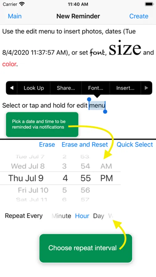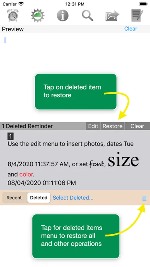 • Reminders with styled text and photos are all conveniently displayed, sorted and accessed in a menu list format