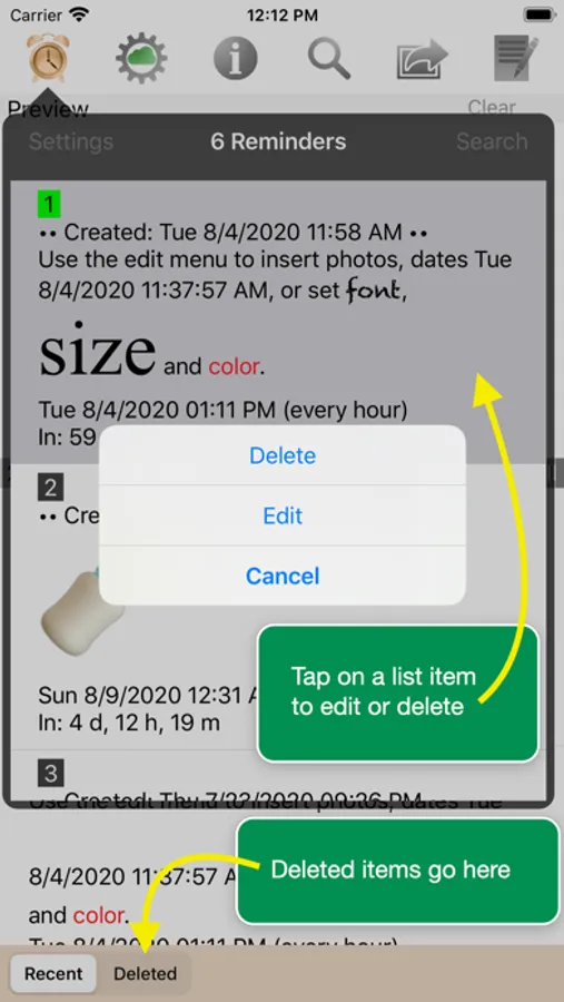 • Recent reminders, i.,e. reminders that have fired, are displayed in a separate list in the main view called “Recents”. You can clear them all at once.