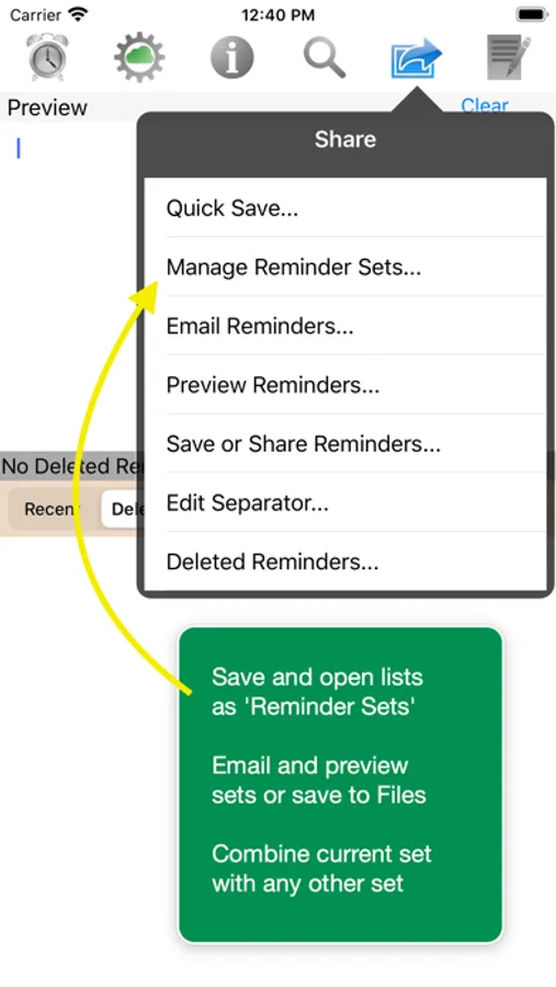 Reminders can be saved into reminder sets that are Menu Minder documents. These documents can be saved and shared. You can email them, or save them in Files.