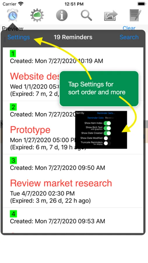 • Reminders can be sorted by their creation, modification, fire and fired date or by text