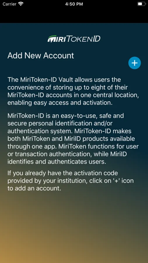 MiriToken-ID is an easy-to-use, safe and secure personal identification and/or authentication system. MiriToken functions for user or transaction authentication, while MiriID identifies and authenticates users. MiriToken-ID makes both MiriToken and MiriID products available through one app.