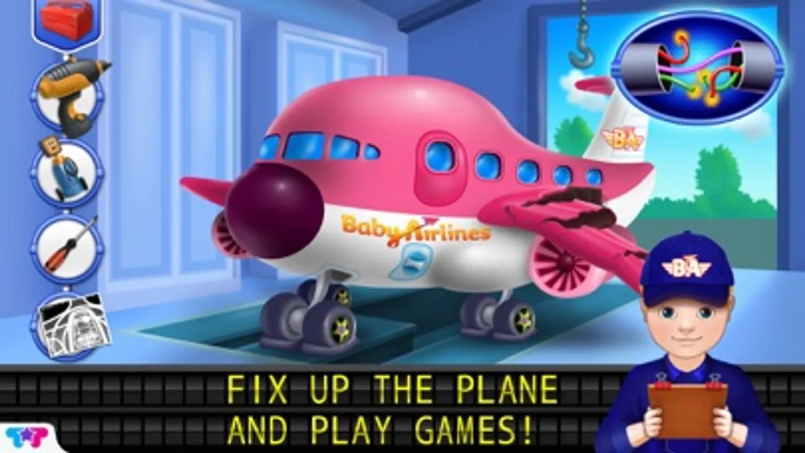 You be the captain! Fly your Baby Airlines plane with the interactive flight simulator! You can even run the airport traffic control tower by solving fun-filled mazes! Don’t forget to fix up the plane so that it's in tip-top shape. Replace the wheels, pump fuel and connect the broken wires! You can even head to the body shop to build and customize your airplane!