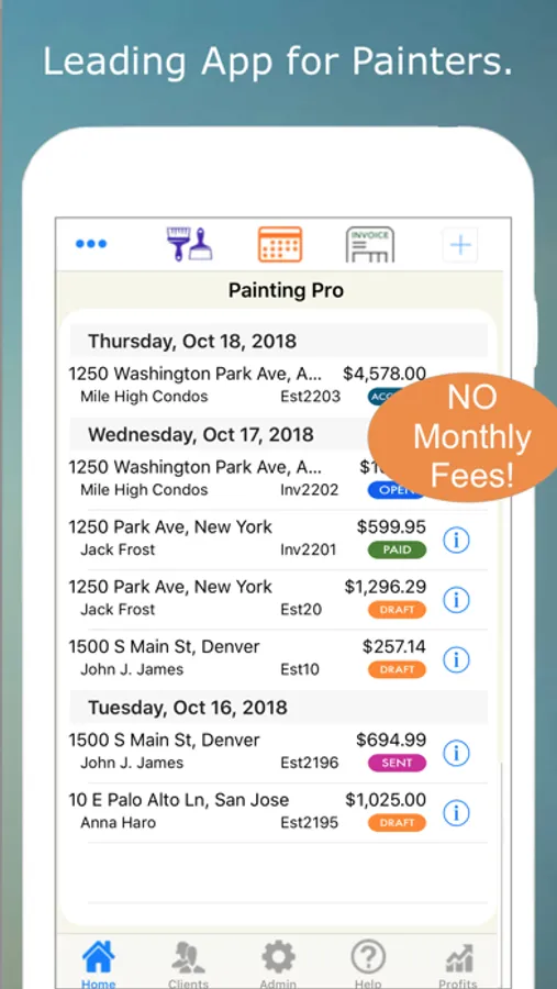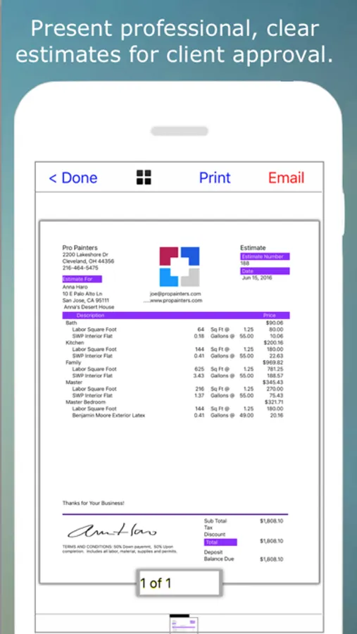 Signature Capture of approved Estimates with an update of Status. Invoices and Estimates may be copied for editing and reuse with other clients.