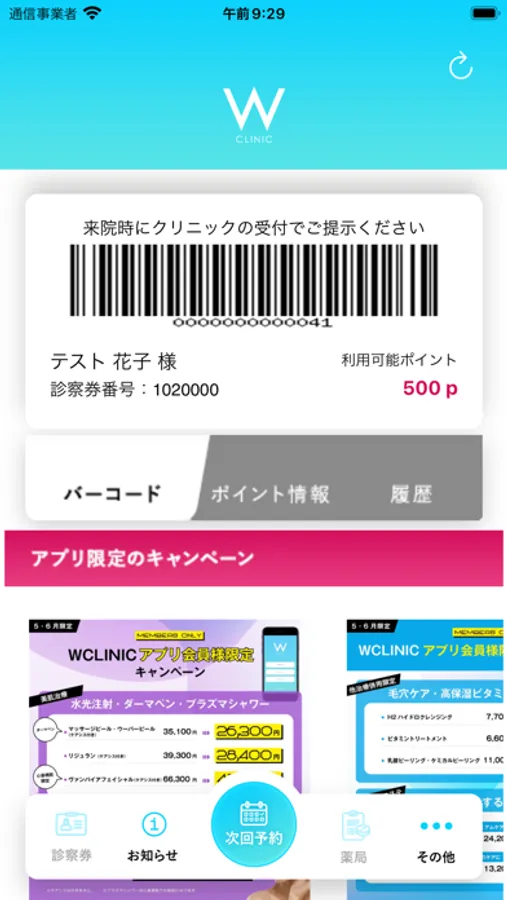 診察券に代わり、自動チェックイン機能、次回来院予定日時や履歴、