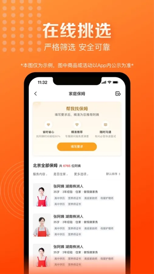 4、在线筛选:在线查看劳动者简历,可进行线上多人面试,找阿姨更迅速;