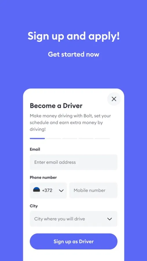 • Sign up to drive inside the Bolt Driver app or at https://partners.bolt.eu;