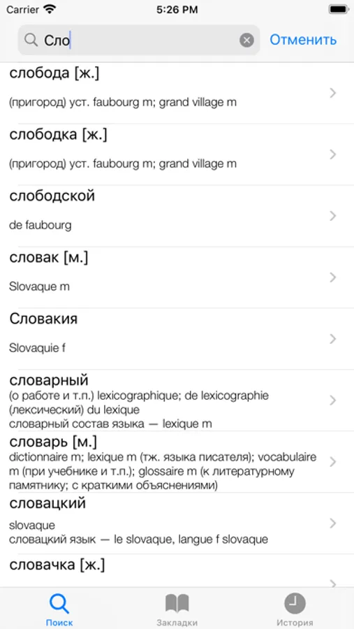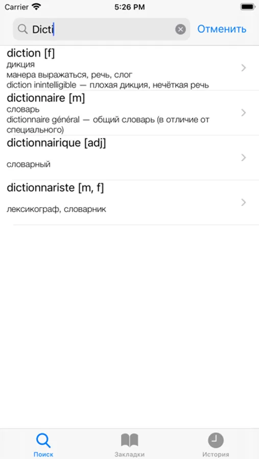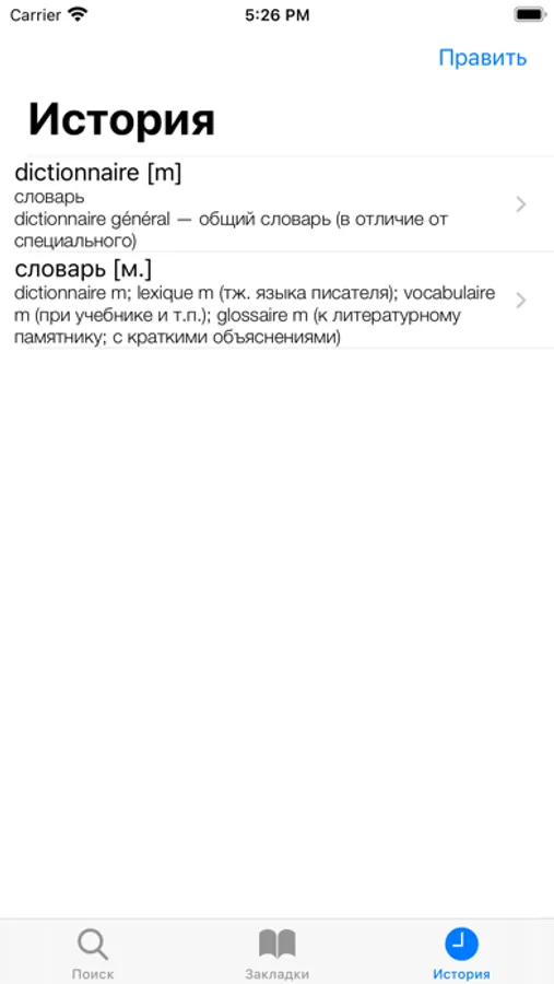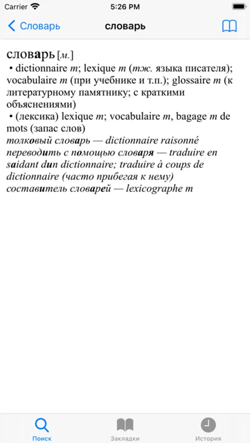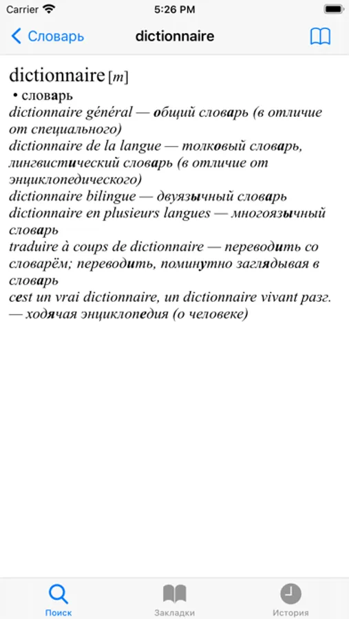 Не требует подключения к интернет! Простой и удобный словарь позволит быстро переводить слова с русского на французский и с французского на русский, видеть варианты перевода и особенности использования слов. Расширяйте Ваш словарный запас день за днем! Особенностью программы является то, что вы уже видите краткий перевод слов пока набираете! Не нужно выбирать слово чтобы видеть краткий перевод. Меньше кликов, больше удобства.