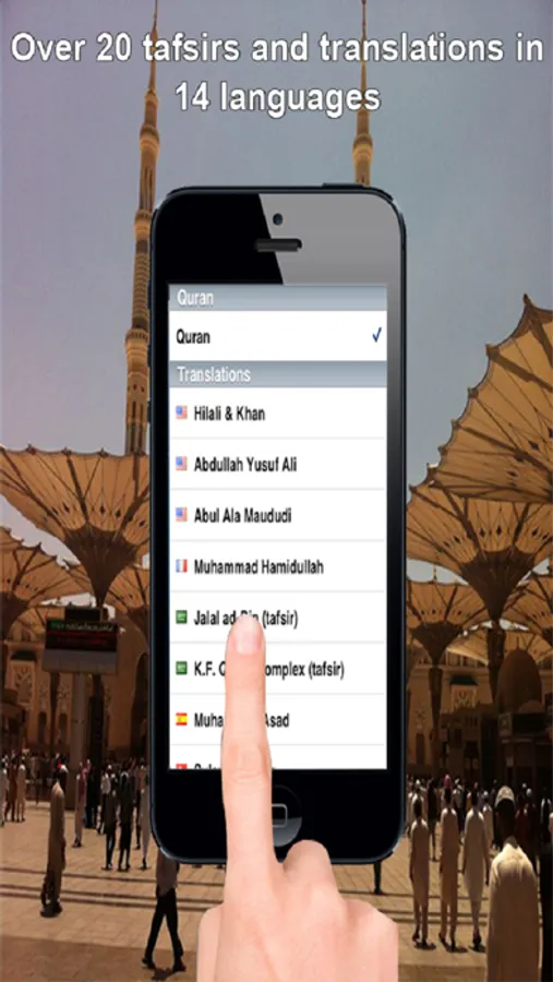 * 10 Translations plus King Fahad Complex and Jalal ad-din Tafseer in Arabic: English ( Abdullah Yusuf Ali, Ahmed Ali, Transliteration), French, Melayu, Spanish, Turkish, Russian, Urdu, Farsi, Hindi.
