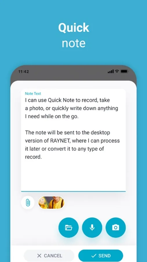 - QUICK NOTE - Send a message from your phone to the desktop version or RAYNET using the quick note feature and process it later (text, photo, audio recording, document).