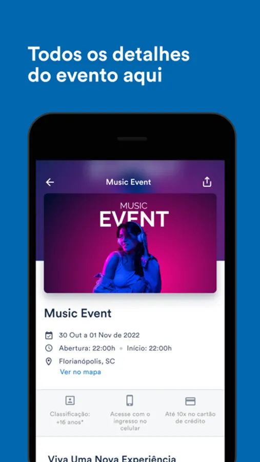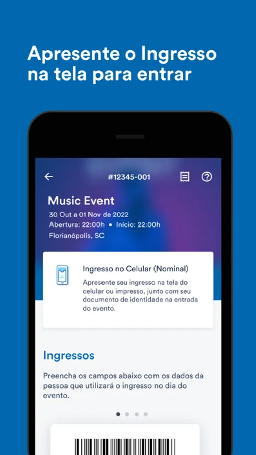 • Apresentar o ingresso na tela do celular para entrar no evento. (Quando o evento disponibiliza)