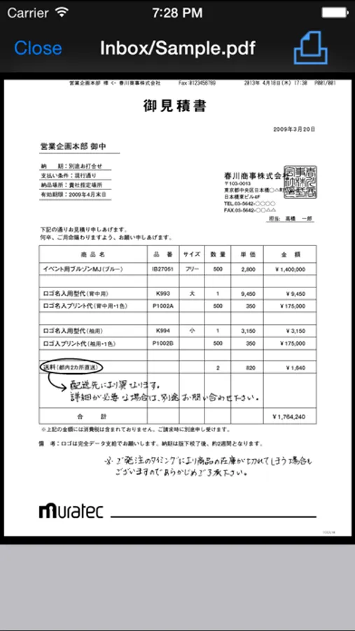 Muratec Mobile works with the "Open in" capability of iOS, so you can print PDFs attached to received e-mail, Dropbox and other applications in which PDF documents are stored.