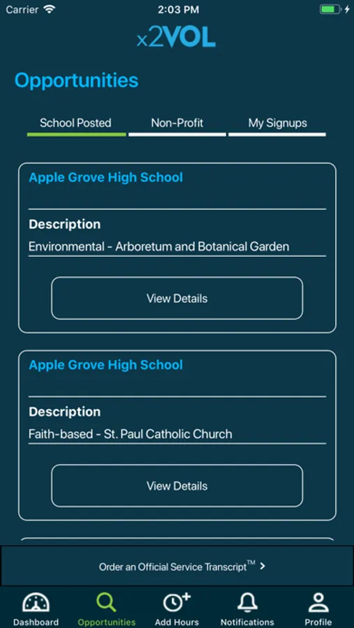 x2VOL is the leading student service hour tracking app in K-12 education. With x2VOL you can customize service goals, centralize service hours, and provide diverse service opportunities. x2VOL provides students with an online and mobile way to track and report service hours specific to the goals of their school while engaging them with nonprofits. Service records are authenticated and verified for each student and can be attached to their college applications, scholarship applications, or resumes through x2VOL’s Official Service Transcript™.