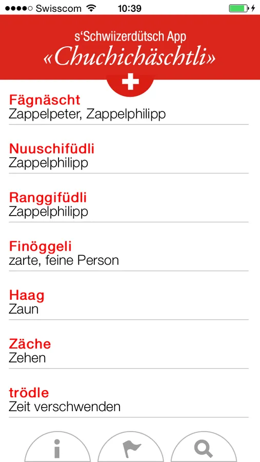 Schwiizerdütsch is the app version of the Swiss-German Booklet "Chuchichäschtli" by Swissboox Verlag.