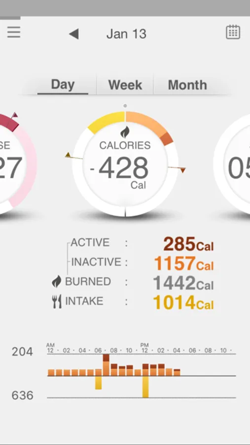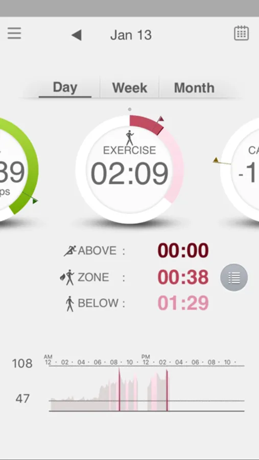 PULSENSE calculates calories burned based upon body motion and heart rate data, which is related very closely to calories burned, enabling more detailed calorie calculation. You can also input your calories manually by pressing the "PEN" button.