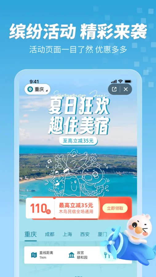 木鸟民宿是国内老牌的短租房、日租房、民宿在线预订平台,于2012年5月正式上线。目前平台覆盖海内外700多个城市,主要分布在北京、上海、重庆、天津、青岛、秦皇岛、三亚、大连、威海、日照、烟台、厦门、承德、大理、北海、深圳、沈阳、成都、苏州、杭州、西安、广州、长沙、昆明、南京、武汉、郑州等城市,拥有135万套房源,累计服务用户1亿+,无论你走到哪里都能找到合适的住宿房源。