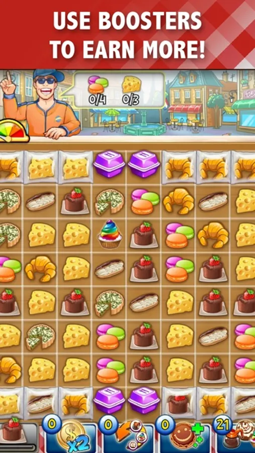 Match orders by connecting 3 or more of the same food tile in the fewest number of moves possible! Boost your earnings and save moves by serving more than one order with a single match!
