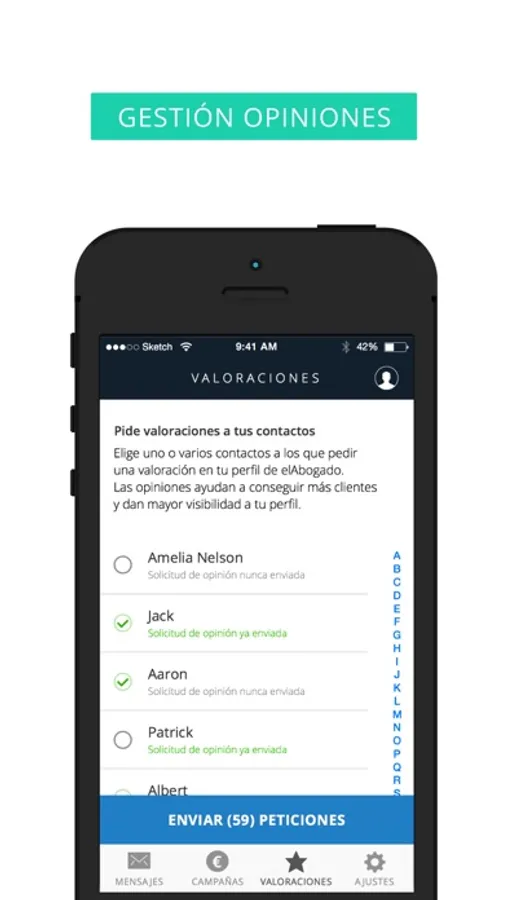 Elige uno o varios contactos a los que pedir una valoración en tu perfil de elAbogado. Las opiniones ayudan a conseguir más clientes y dan mayor visibilidad a tu perfil.