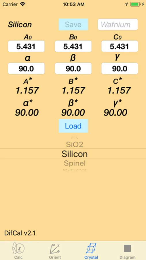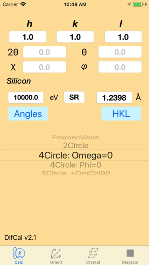 Calculate diffraction angles for a particular crystal with a defined orientation matrix. New crystals can be added to the database. Energy/wavelength can be changed. Currently knows about 4-circle, Z-Axis and Theta-Theta diffractometers.