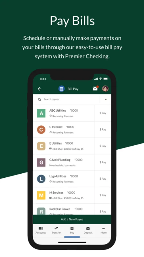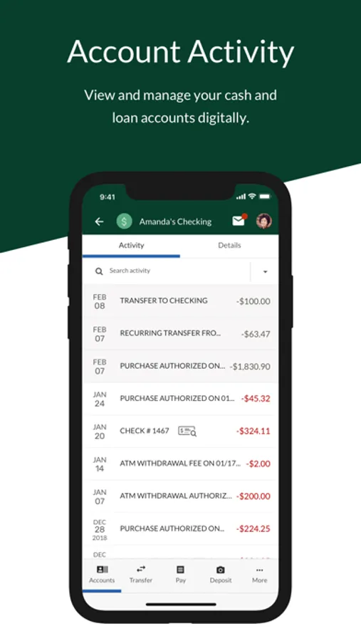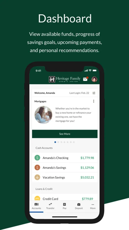 Accounts: View and manage you cash and loan accounts digitally. Review recent transactions, see current balances, and search for specific payments or deposits.