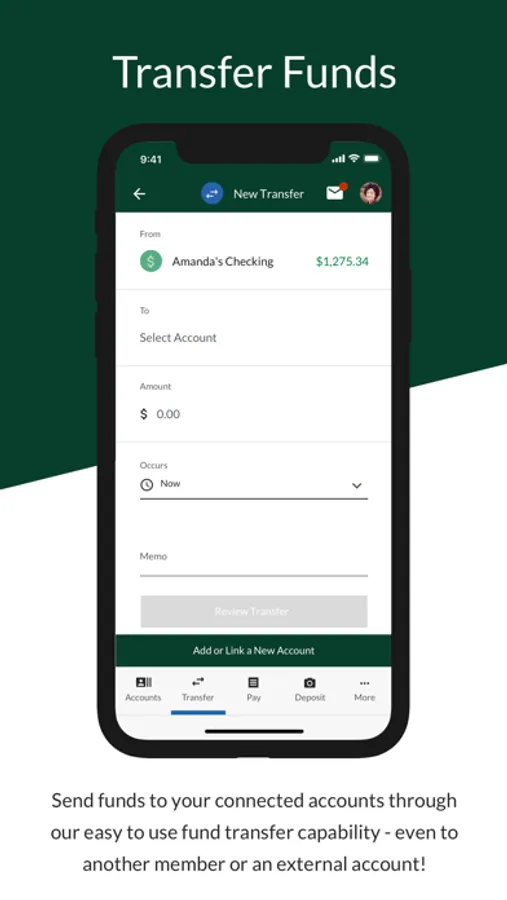 Transfers: Send funds to your connected accounts through our easy to use fund transfer capability. You can even transfer funds member-to-member or to an external account!